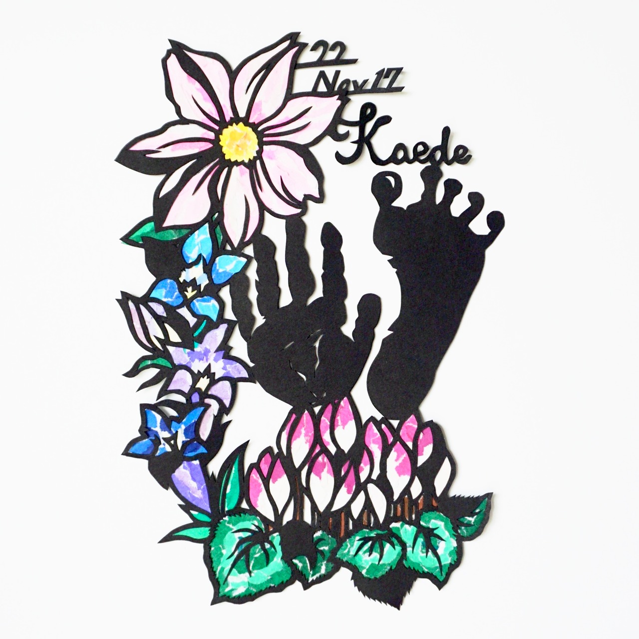 ①A4用紙に原寸の両手形足形を黒インクでお取りください。