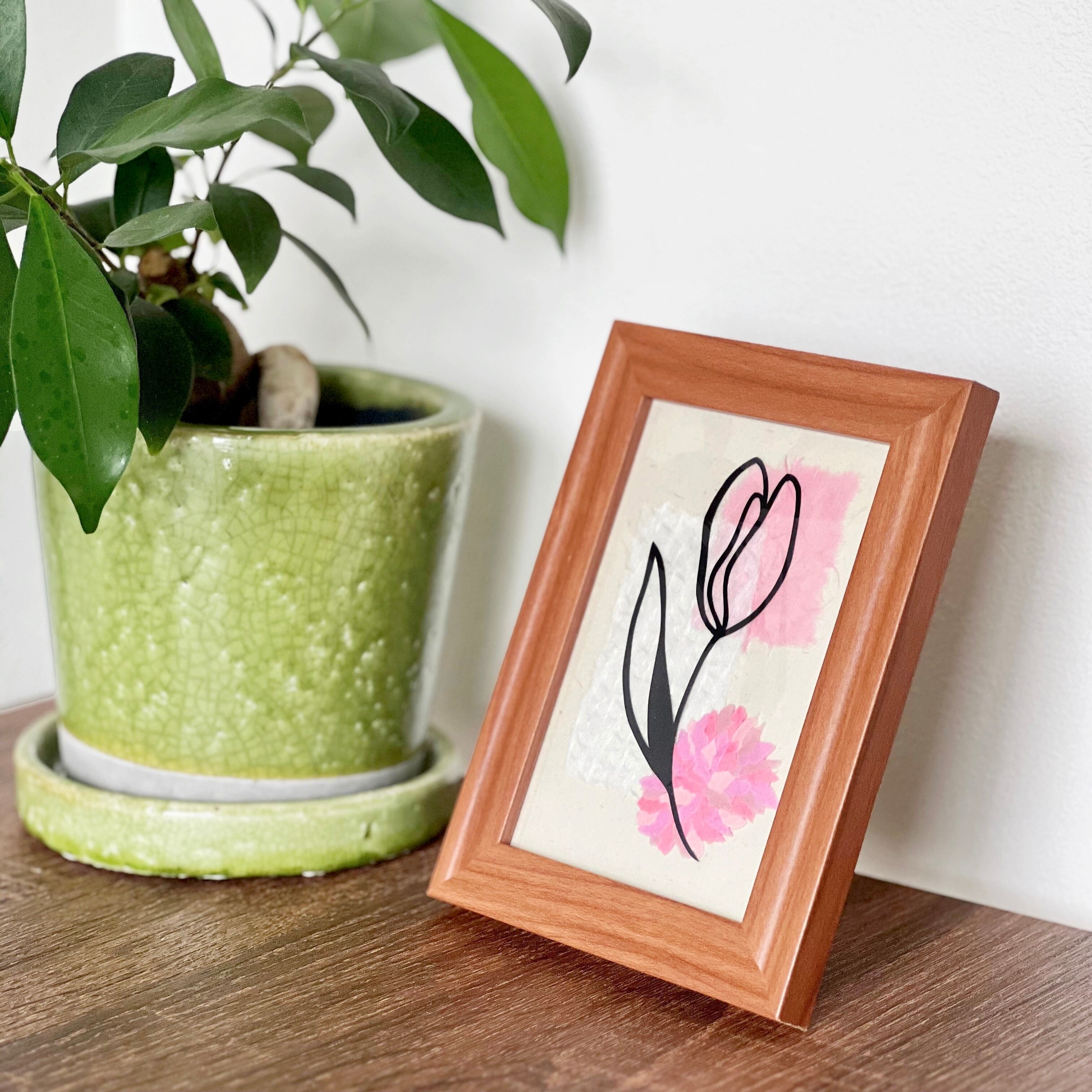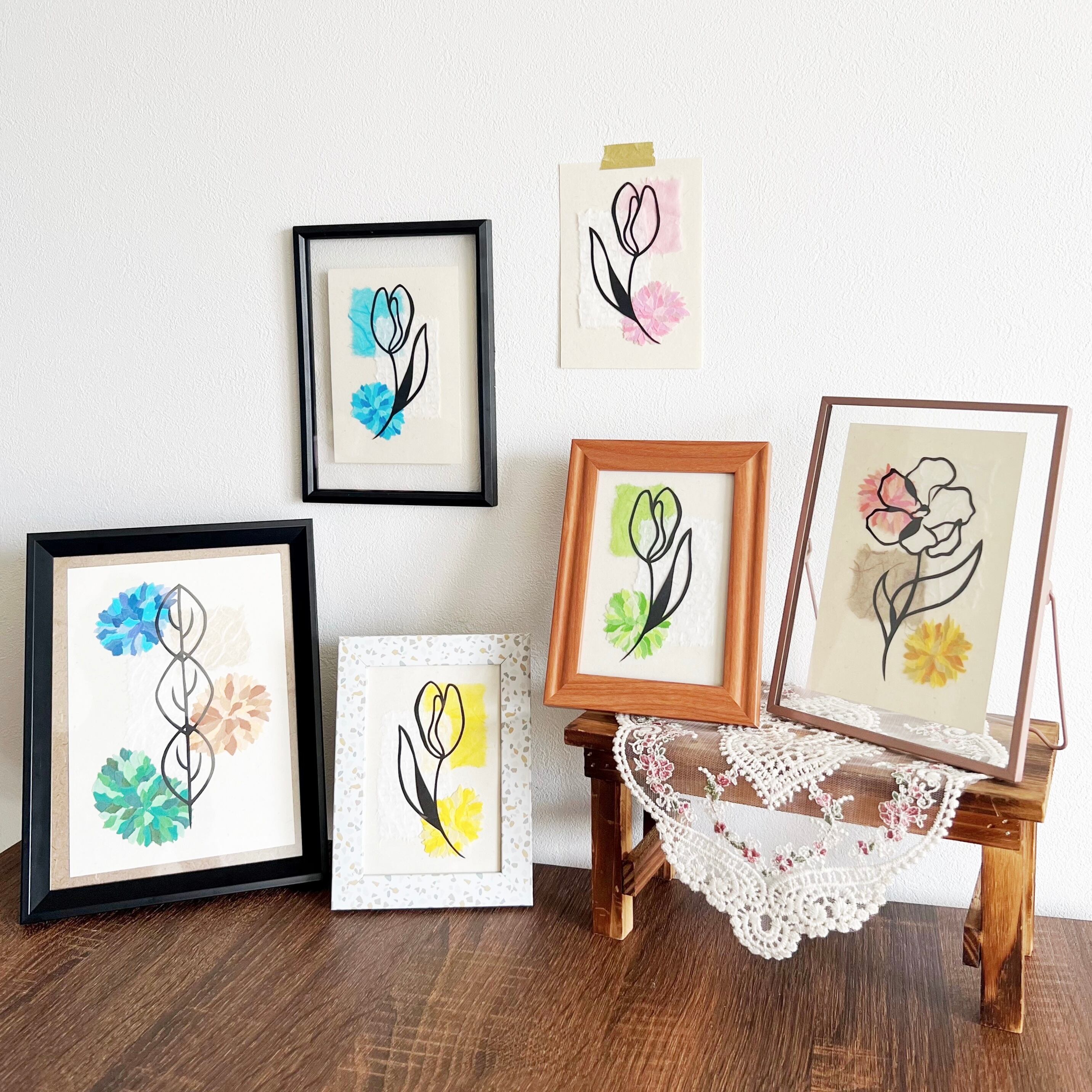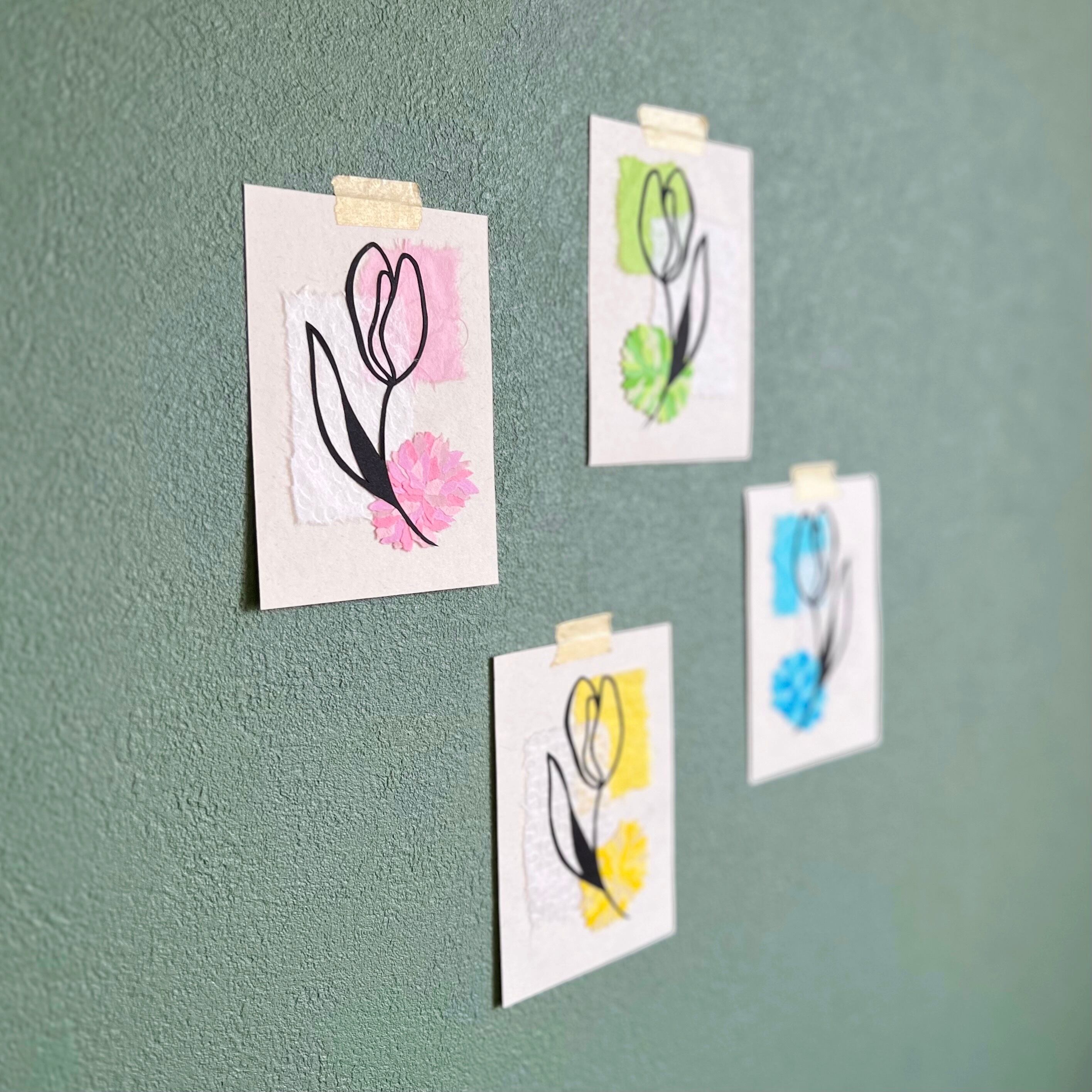 シンプルながらも美しい、紙で描かれたチューリップのアート作品です。