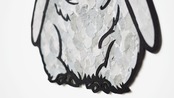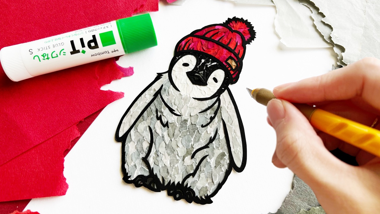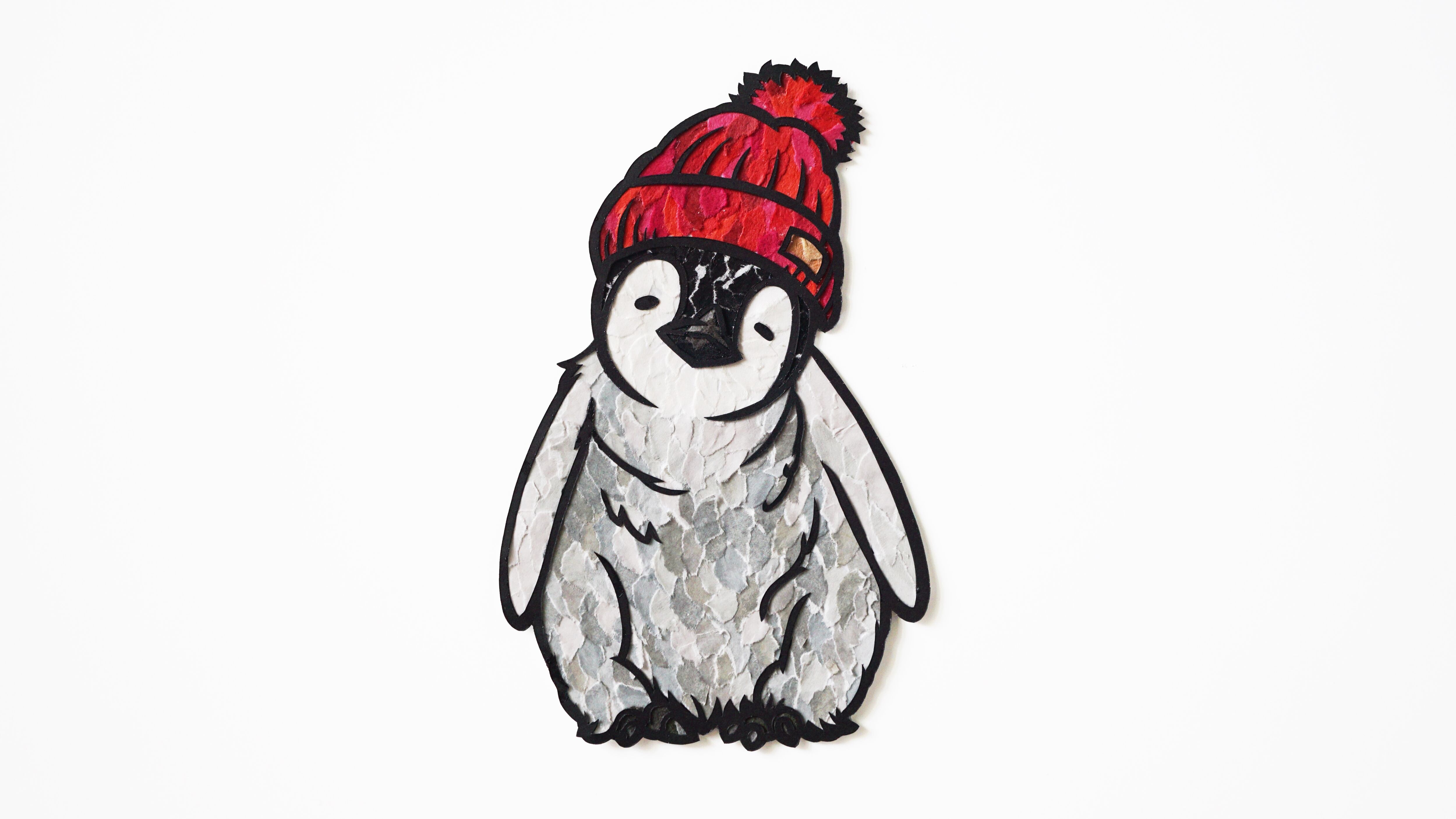 ペンギンの愛らしい表情が特徴のアート作品です。